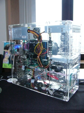 「COMPUTEX TAIPEI 2005で次期主力GPUが発表されるかも」という情報もあったが、今回は姿を見せず、その代わりに主役となっていたのが「次期主力統合型チップセット」のCrush 51だ。プライベートブースにはCrush 51を搭載したマザーボードのサンプルが多数。さらに、実際に動いているシステムも展示されていた。