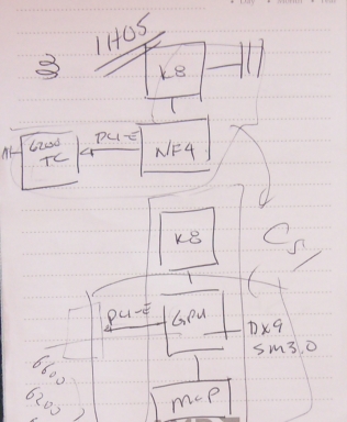 英語が拙い記者のために、ヘンリー氏はnForce 4&GeForce 6200 with TurboCacheとCrush 51の違いを図を描いてていねいに説明してくれた。Crush 51のGPUはDirect X 9とSM 3.0をサポート。パイプラインの数や動作クロックなどは「まだ言えませんね」(ヘンリー氏)Copyright © ITmedia, Inc. All Rights Reserved.