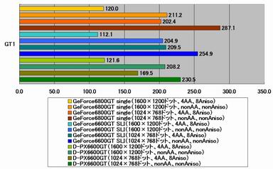 D-PX6600GTのベンチマークでも、GV-3D1のベンチマークでも、3DMark03 GT1/GT4の結果を比較すると、GT4ではデュアルGPUカードが良好であるのに対して、GT1では2枚構成のパフォーマンスが上回る。こうしてみると、重負荷処理においてデュアルGPUカードは良好なパフォーマンスを発揮できるが、負荷が軽くなると2枚構成のパフォーマンスに劣ってしまう傾向があるようにうかがえる。