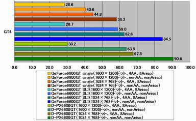 市販ゲームのベンチマークでGeForce 6600GTのNVIDIA SLI構成がGeForce 6800GT単体にかなわないのはピクセルパイプラインの本数やシェーダユニットの数といった、内部構成の違いによるものと考えられるが、クロックアップしているはずのD-PX6600GTが定格動作のGeForce 6600GTを下回ってしまうのはなぜだろうか。