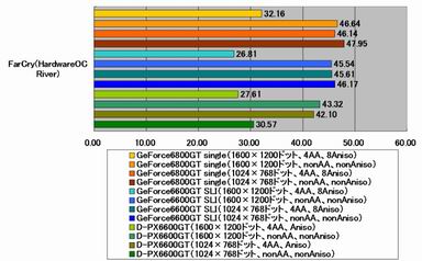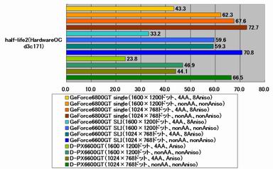 しかし、それ以外のベンチマークでは様相が変わってくる。Aquamark3ではGeForce 6800GT単体構成をわずかに上回るものの、同じGeForce 6600GT2枚によるNVIDIA SLI構成の結果を下回り、DOOM 3、Farcry、half-life 2では単体のGeForce 6800GTをも下回るようになる。
