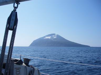 いかにも「島」という姿の利島。構図的には島を大きく切り取ったほうがいいのだろうが、船乗り的には「滑車」「ロープ」「セール」をフレームにいれておきたい。ただ、船を一部分を島と一緒に写しておくと、島の大きさや距離感が演出できる、というメリットはあるCopyright © ITmedia, Inc. All Rights Reserved.