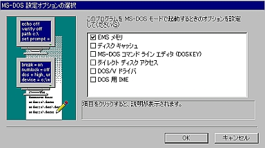 「新しいMS-DOS設定を指定する」の「設定」ダイアログで「EMSメモリ」以外のラジオボタンをオフにすれば、コンベンショナルメモリを空けるのに必要なCONFIG.SYSの雛形が自動で記述される。CONFIG.SYSの設定で新たに出現した「EMM386.EXE」のパラメータとして「RAM」を加えれば、とりあえず600Kバイト程度のコンベンショナルメモリ領域が確保できる。