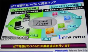 松下電器産業は、フィールドモバイルPC市場とビジネスモバイルPC市場の2つに特化して事業を進めていると解説。オフィス向けのPCはすでに行き渡っているが、個々の現場ではIT化がまだ始まったばかりであり、市場はますます拡大していくことが想定される。一方でワイヤレスの進化が激しく、いつでもどこでも使えるPCのニーズも高まっており、軽量・長時間動作という特徴を生かせるビジネスモバイルPC市場にも将来に大きな成長の可能性があると言及した。