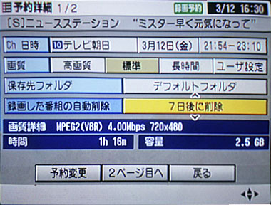 録画予約画面では、画質のほかにも、日時やチャンネルの変更、毎日、毎週、または曜日指定による連続録画などを設定可能。音声記録方式は、MPEGのほかにドルビーデジタルにも新たに対応した。録画番組は、フォルダに分けて保存することも可能となり、最大20個までの新規フォルダを作成して、連続ドラマなどの番組別に保存したり、使用者ごとに分類しながら管理できる。フォルダ単位での録画番組の一括削除も可能となっている。