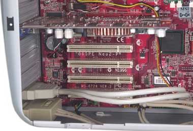 拡張カードは、最大5枚追加できる。とはいえ、現状ではUSB2.0とIEEE1394の増設ブラケットが装着されているので、不必要なら外すこともできる。背面の下方には通気口がないので、空気が滞らないよう、1段ごとに装着するのが理想的だろう。