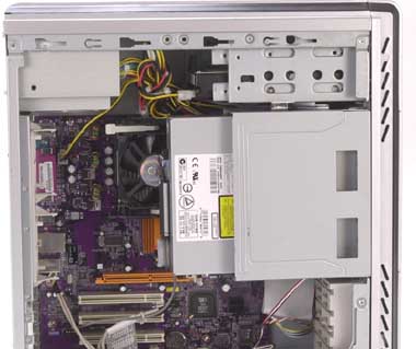 内部スペースを見ると、各パーツが高い密度で組まれているのが分かる。一見、余裕がない構成だが、AGP、PCIスロット部には十分な空間があるので、増設に手間取る心配はない。また、3.5インチシャドーベイの増設は、フロントパネルから行うなどの工夫も凝らされている。