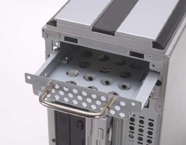3.5インチシャドーベイは、フロントパネルから引き出せるスタイルのドライブが採用され、内部からコネクタさえ引き込めば、手軽に増設できるのはうれしい。ベイの前面に取っ手が付けられ、引き出して作業できるのである。HDDは、メンテナンス中の不注意が故障につながりやすい繊細なパーツだけに、この配慮はありがたい。