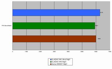 3DMark03の結果をGeForce 6800 Ultra搭載の「GLADIAC 940 Ultra」、ノーマルGeForce 6800搭載の「GLADIAC 940」、そしてGeForce 6800 GT搭載の「Aeolus 6800 GT」で比較してみると、軽負荷から重負荷に移行した場合のAeoles 6800 GTにおけるテスト結果下落幅は、ノーマルGeForce 6800よりもGeForce 6800 Ultraのそれに近い。