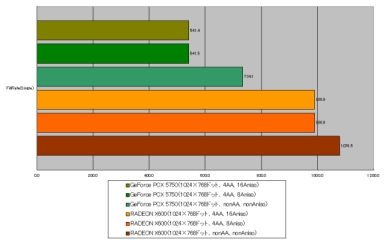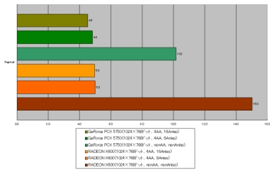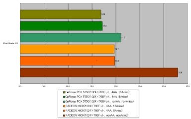 対して、GeForce PCX 5750の結果は完全にGeForce 5700を下回っている。先日紹介したPCI Express対応のGeForce 6800 GTのベンチマークの結果が、AGP対応のGeForce 6800 GTとほとんど同じだったことを考えると、今回のベンチマークでもGeForce PCX 5750とGeForce 5700の結果はほとんど同じ、もしくは動作クロック分だけGeForce PCX 5750が上回るはずだが、結果はまったく逆となってしまった。