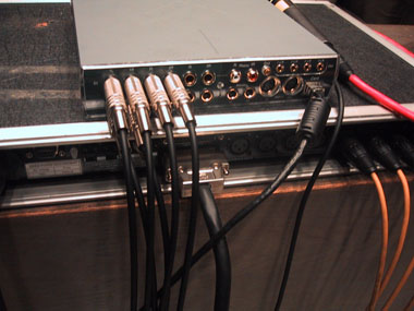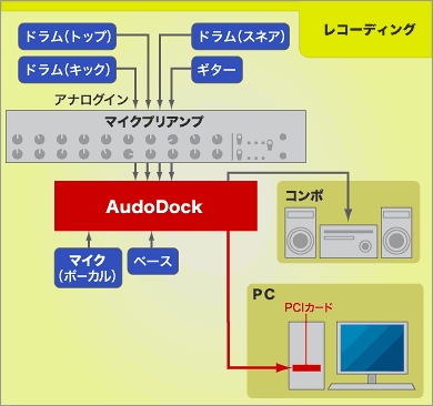 ドラムのキック、スネア、トップ、ギターを外付けのマイクプリアンプに接続し、それをAudoDockの背面に接続。ボーカルとベースをAudoDockの前面についているマイクプリアンプに接続する。また、AudoDockの背面にコンポなどを接続しておけば、作業中の音源をモニター可能だ。