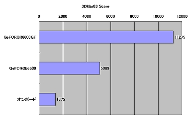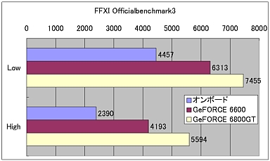CPUにも高い処理能力を要求する最近の3Dゲームはどうだろう。選択したマザーボードは3Dグラフィックス機能も備えているので、これと1万円前後で購入できるGeForce 6600搭載グラフィックスカード、また、コストパフォーマンスを検証するために、価格的には突出するGeForce 6800GT搭載グラフィックスカードを用意。これらを3DMark05と3DMark03、さらに「Final Fantasy XI Officail Benchmark3」で性能を比較してみた。