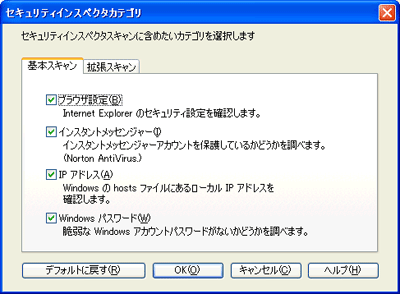 また、セキュリティインスペクタ機能により、Windowsの一般的なセキュリティ不備も調査できる。調査内容はファーミング(*3)の原因となるHOSTSファイルの書き換え、パスワードの脆弱性、共有フォルダの不備などだ。