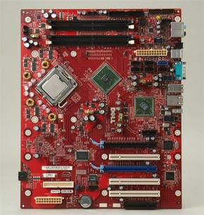 XPS 700のマザーボードはnForce4 SLI X16 IntelEditionを搭載したBTXタイプと実に個性的な仕様。評価機のグラフィックスカードはGeForce 7900 GTX 512のNVIDIA SLI構成であったが、このようにアジャスタで筐体に固定されている。そのサイズからはGeForce 7950 GX2が組み込めそうな感じであるが、デルはXPS 700のBTOメニューとして用意していない