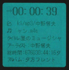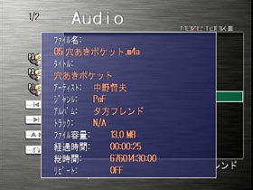 音楽再生時には自動で情報ウィンドウが表示され、曲名やアーティスト、再生位置などを常時確認できるようになっている。上下ボタンを操作すると、再生を停止せずに同一フォルダ内の別の音楽ファイルを選択して再生することも可能だ。黄色が再生中、緑の反転部分が選択操作中のファイルになる旧モデルでは便利なようで不便に感じられた、「再生」ボタンを押すとフォルダ内先頭ファイルからの連続再生、という動作はなくなり、「決定」「再生」ともに選択中ファイルからの連続再生と、操作は分かりやすくなった。ただし静止画再生だけは「再生」ボタンを押した場合のみ自動連続再生(スライドショー)となり、「決定」ボタンを押した場合には前後のファイルへの移動は「前へ」「次へ」ボタンで操作することになる(もっとも、どちらの場合でも選択中のファイルから再生されることに違いはない)。静止画再生に限ればこの使い分けは有効と思われるので、旧モデルの便利な部分だけをしっかりと残した印象だ。