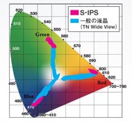 S-IPS液晶の技術解説(写真=左)。その右は液晶ディスプレイの角度を±80度で変えたときに見える色の変化量を示したグラフで、S-IPS液晶は一般的なTN液晶に比べて角度による色合いの変化が少なく、キレイな映像を提供してくれるPrius One type W AW37W5Uは、20.1インチワイドのS-IPS液晶ディスプレイを搭載することにより、前述のように上下/左右178度の広視野角を誇る。論より証拠で、まずは下の写真を見比べて欲しい。