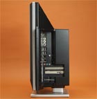 前面中央にDVD±R DL対応のスロットインDVDスーパーマルチドライブを内蔵し、メディアの出し入れが容易に行える(写真=左)。その下部にあるカバーを開けると、多彩なインタフェースが顔を出す(写真=中央)。カバーを閉じれば見た目がスッキリとする。背面に出っ張らないL字型の電源ケーブルが付属している点にもこだわりを感じさせる(写真=右)本体は後ろ10度のチルト機能と、左右90度ずつのスイーベル機能に対応しており、微妙な角度の調整が容易に行える。初回の設置も、電源ケーブルとTVアンテナケーブル、そしてLANケーブルだけを接続するだけですむ。これは、PCにつながれた大量のケーブルの見苦しさに頭を悩ませる上級者から、PCの設置に自信がない初心者まで広い層に訴えかける魅力だろう。