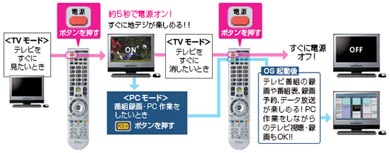 地上デジタル放送の視聴には、OSを起動せずに電源投入から約5秒でTV番組を楽しめる「エコ・ポン・パッ!」か、OS起動後にTVアプリケーションの「Prius Navistation5」を利用する。前者は本機を液晶TVライクに使うことが可能で、待機電力も約2ワットと少ないのがうれしい。なお、「エコ・ポン・パッ!」利用時にリモコンの「PCモード」ボタンを押せば、OSが立ち上がるので切り替えはスムーズに行える。