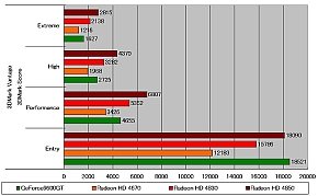 3DMark Vantageにおいては、プリセットされているテストモードの総合スコアで、最も負荷の軽い「Entry」モードでGeForce 9600 GTがRadeon HD 4830を上回るものの、ほかのモードではRadeon HD 4830がGeForce 9600 GTを抑えている。また、解像度と負荷条件をカスタマイズして測定した場合の「Graphics Score」は、すべての設定条件でRadeon HD 4830の結果がGeForce 9600 GTを超えた。