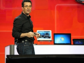 第2世代のCore i7やAMDの“Fusion”APUを採用したPCを紹介するMicrosoft 上級副社長 兼 ウィンドウズチームのマイケル・アングイロ氏(写真=左)。“Fusion”APUを採用したヒューレット・パッカードのモバイルPCでは、250匹の魚を同時に泳がせることができる。このパフォーマンスのPCが500ドル以下で手に入るという(写真=右)
