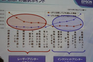 プリンターの市場規模。最も多くのプリンタが販売される年末商戦期も含めて、対前年比を上回った(写真=左)。インクジェットプリンタのシェア。秋冬モデル投入時の51%は達成できなかったものの、年末商戦は台数、金額ともにトップシェアを獲得した(写真=中央)。特に数多く販売されたのが「EP-803A」だ。またキーボード付きのコンパクトプリンタも好調という(写真=右)続いて中野氏は、今回3機種が投入されたビジネスプリンタ市場についても説明した。現在ビジネスプリンタ市場(2009年時)は、236万台の市場規模のうち、レーザープリンタとインクジェットプリンタが2分する状況にある(レーザー55%、インクジェット45%)。同社が行った調査によると、インクジェットはコストが安く省スペースな点が、レーザーは印刷速度の速さがそれぞれ購入要因となっており、例えば机の脇などに置いた環境で利用するなら前者、大量の文書を印刷する環境では後者が選ばれているという。そこで同社は、ビジネスインクジェットプリンタで印刷速度と耐久性向上に取り組み、新たに3機種を加えて、ラインアップを拡充していく。
