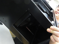 入荷したTSUKUMO eX.は「フロントの外観はアルミの削りだしですっきりとまとめていますが、じゅうたんなどに置かなければ、前面吸気タイプよりも効率的な空調ができると思います。静音性とデザイン性を両立させながら、安心してハイスペックな構成が組めるのがポイントですね」と嬉しそうに評価していた。