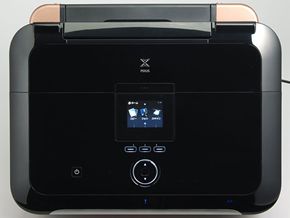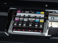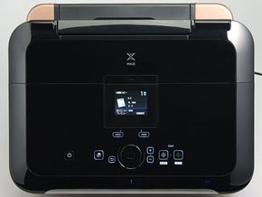 ボディの上部を持ち上げると、6色独立式のインクカートリッジが現れる(写真=左)。普通紙印刷によく使われる顔料ブラックは容量が大きいカートリッジを採用する。プリントヘッドの上にインクを装着するオンキャリッジの設計だ。スキャナはCISセンサー搭載で、原稿台の周囲はすっきりまとまっている(写真=右)天面に配置された操作パネルは、PIXUSが昨年から取り入れた「インテリジェントタッチシステム」(Intelligent Touch System)を継承している。