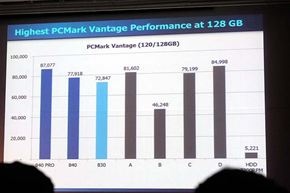 PCMark Vantageのスコア比較(120/128Gバイト)における840 PROのスコアは87077で、他の競合製品をすべて上回っている(写真=左)。PCMark Vantageのスコア比較(240〜256Gバイト)でも840 PROがトップだ(写真=右)