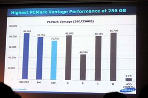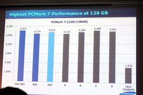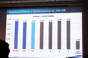 PCMark Vantage、PCMark 7、IOMeterといった主要なベンチマークテストのスコアはいずれもSamsungの評価では最速をマーク。さらに、性能の持久力を検証するテストの結果も公開され、Samsung SSD 830シリーズから定評のある「使い続けても遅くならない」特性もアピールされた。