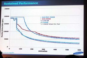Iometerによるランダムリード/ライト性能の計測結果でも840 PROの高性能が目立つ(写真=左)。性能持久力テストの結果において、840 PROよりも840のほうが長く高い性能を維持しているのは、840ではあらかじめオーバープロビジョニングが設定されているためだ(写真=右)