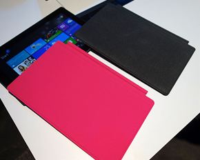 キーボード付きのカバーは、クリック感がなく感圧式センサーを内蔵した3.25ミリ厚のTouch Cover(下)と、メカニカルキーボードが備わった6ミリ厚のType Cover(上)を用意している(写真=左)。ひっくり返したカバー表面(写真=右)Surfaceは全米に60店舗を展開するMicrosoft Storeと、インターネット上のMicrosoft Online Storeで10月26日(米国時間)から販売が開始される。価格は32Gバイト版で499ドル。実物は高性能かつ、とても高い質感を持っていた。iPadを多分に意識した価格だが、果たして市場はどのように反応するだろう?
