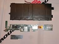 システムボードとバッテリーの表(写真=左)と裏(写真=中央)。表の状態で下に見える四角い基板は、オプションのNFCモジュールだ。裏の状態で主要チップを収納した部分を見ることができる(写真=右)。通常は銀色の金属製カバーで覆われている