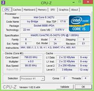 CPU-Zの情報表示。評価機のCPUはCore i5-3427Uを搭載していた(画面=左/中央)。デュアルコアでHyper-Threadingに対応しており、4スレッドの同時実行が可能だ。定格クロックは1.8GHz、Turbo Boost 2.0により、高負荷時は最大2.8GHzで動作する。メモリはDDR3-1600 SDRAMをオンボードで搭載しており、容量は4Gバイトで固定だ(画面=右)。メモリの接続はシングルチャンネルだったデータストレージの容量は、約64/128/256Gバイトの3種類から選べる。いずれもSerial ATA 6Gbps対応のSSDだ。評価機のSSDは約64Gバイトだが、デバイスマネージャで確認するとSamsungのmSATA SSD「MZMPC064HBDR-00000」だった。プリインストールOSは、64ビット版のWindows 8に統一されている。