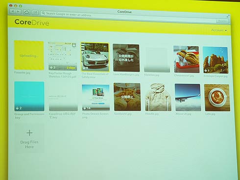 CoreDriveの特徴は大きく3つある。1つは、「貼り付ける」感覚で、ファイルを直接ブラウザ上にドラッグ&ドロップすれば共有できること。2つ目は貼り付けたファイルのサムネイルが生成され、一目で中身が分かることだ。写真データなどであれば画像が縮小されて表示されるし、Zipファイルであれば圧縮したファイル名が並び、音声データの場合は波形が表示される、という具合だ。公開期限が切れてダウンロードできなくなっているファイルなども一目で分かる。