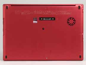 天面は継ぎ目などがなく美しい仕上がりだ(写真=左)。左上の端が欠けたような外観になっているが、これはFMVのフラッグシップモデルを示す新しいデザインという。底面のネジは、ゴム足やボディカラーと同色のキャップで隠されており、見栄えがよい(写真=右)。製品名や注記、各種規格のロゴはレーザー刻印で目立たないよう配置しており、吸気口の形状にまで気を配っている。こちらは直販モデルのWU1/Lで、底面にオプションのポートリプリケータ接続用コネクタがある構成だ