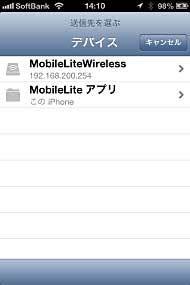逆に、iPhoneで撮影した写真や動画をSDカードやUSBメモリーにコピーすることも可能だ。その場合は、デバイス一覧で「MobileLiteアプリ」(このiPhone)を選択する。ただし、iPhoneの「カメラロール」から直接SDカードなどにコピーするのではなく、一度アプリ上に登録してから改めて送信先(コピー先)を選ぶという手順になる。
