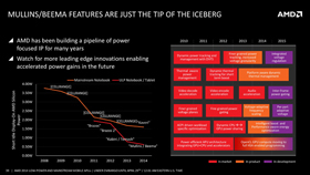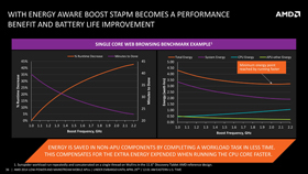 ブースト動作時に、使わない機能を積極的にOFFにすることで、パフォーマンスを向上させつつも、消費電力へのインパクトを最小限に抑えることを可能にする(画面=左)。AMDが公開した省電力技術ロードマップ。SoCへの電源回路統合などが計画されていることが分かる(画面=右)