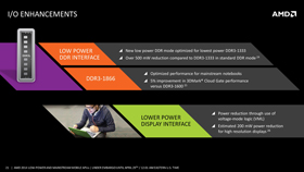 また、バッテリー駆動時間を引き延ばすため、ブースト動作と同時にSoCの利用しない機能をすばやくオフにすることで、消費電力の低減を図っている。さらに、MullinsとBeemaでは、半導体製造技術の成熟と半導体設計の最適化により、リーク電流はTemash/Kabiniに比べて、CPU部で19%、より専有面積の大きいGPU部ではその倍の38%を削減することに成功している。