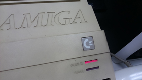 アミガ実機。「Intel outside」なのでお間違えなく(写真=左)。テクノロジーデモ。アミガの代名詞とも言える「Boing Ball」デモをリクエストしたが、残念ながら手元にはないとのこと(写真=右)ぴゅうた買えや