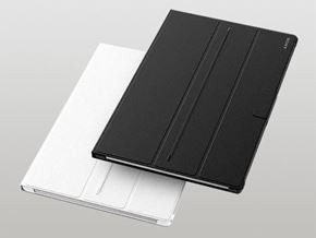 スタンド機能付きフリップ/ブックレットスタイル保護カバー「SCR12(W)/(B)」は、ホワイト(W)とブラック(B)を用意。タブレット本体をすっぽり覆うカバーで、前面のフタは3カ所が曲がる構造だ。カバーの開閉に合わせて、画面表示のオン/オフが自動で切り替わる。カバー単体でのサイズは約266.3(幅)×175.5(高さ)×20(奥行き)ミリ、重量は約260グラム。タブレット本体と合わせた総重量はWi-Fiモデルで約686グラム、LTE/3Gモデルで約699グラムだ