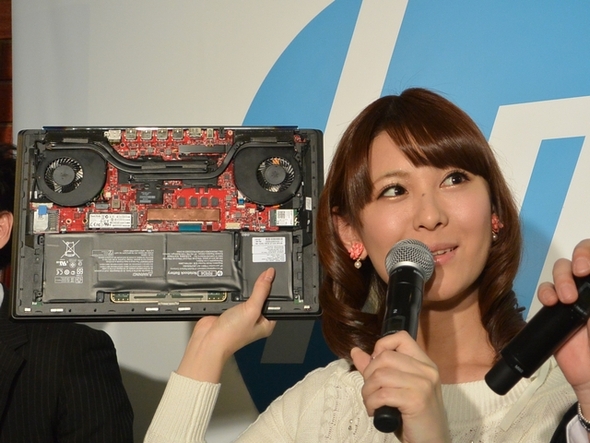 園田氏は、HP OMEN 15がクアッドコアCore i7シリーズやGeForce GTX 860Mといった高い処理能力を発揮するシステム構成や厚さ15.5ミリの薄型ボディ、高性能薄型ゲーミングPCで重要となるデュアルファンと新デザインの太径平打形状ヒートパイプによる排熱機構、レーシングマシンをイメージしてヒンジに“焼けた金属”のような塗装を施したボディデザインなどをアピールした。
