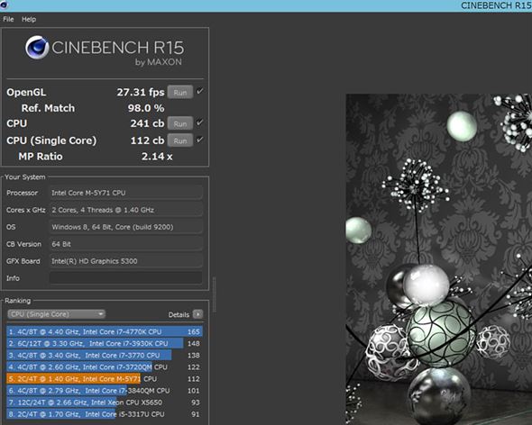 CPU性能を評価するCINEBENCHのスコアだが、最新版のR15ではCPU(マルチ)が241cb、CPU(シングル)が112cb、従来版のR11.5ではCPU(マルチ)が2.38pts、CPU(シングル)が1.22ptsという結果だった。R15のスコアは2in1の人気モデル「Surface Pro 3」に搭載される第4世代Core i5-4300U(1.9GHz/最大2.9GHz)に比べて、CPU(マルチ)で約94%のスコア、CPU(シングル)でほぼ同等という結果だ。