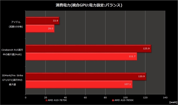 消費電力は、SSDの違いやBIOSアップデートにより設定が完全に同じとはいえない可能性があるものの、計測結果をみる限り、A10-7850KとTDPが同じでも消費電力が増えている印象だ。とはいえ、今回の検証環境のように、最小限の構成であれば150ワット以下で十分に足りる。電源ユニット容量の余裕や変換効率を考慮しても、必要な容量は300ワットクラス、あるいは150〜200ワットクラスのACアダプタあたりだろう。