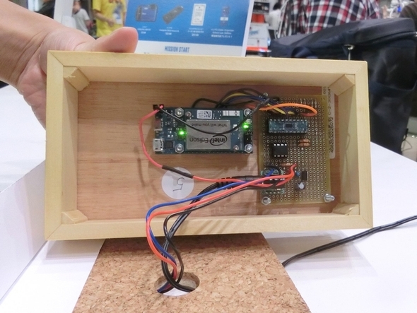 クレーンゲームを音声認識でコントロールする。EdisonはLinuxマシンなのでUSB接続マイクを組み合わせるだけで音声デバイスが使えるから、音声認識を利用するデバイスの開発が容易だという。ただし、会場の騒音に対応するため、スタートにはコインを入れるメカで対処したとのことMFT2015会場内にいくつか置いてあったバーチャルスタンプラリー(Android、または、iOS導入デバイスにアプリを入れて、このあぷりに“スタンプ”的なログを残す仕組み)のスタンプ台にもEdisonが入っている。MFT2015に参加しているEdisonユーザー会は「MFT2015の会場にあるEdisonは5万台」と述べていたが、3ケタのEdisonは間違いなく会場内にあった。