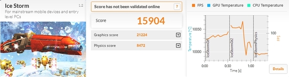 グラフィックス、特にゲームにおける描画処理能力を測定する「3DMark」では、最も負荷の軽いIce Stormで「15904」、エントリークラスのノートPCが対象のCloud Gateで「1297」、そして、ゲーミングノートPCが対象のSky Diverで「881」となった。
