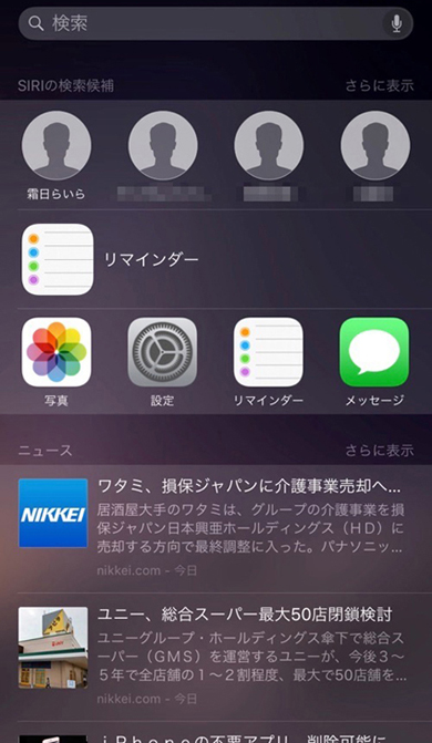 iOS 9では検索機能も強化されています。ホーム画面を右へスワイプすると、よく使う連絡先やアプリ、ニュースが一覧で表示されるようになりました。ニュースは現在地情報に基づいた話題のニュースが8本までピックアップされます。