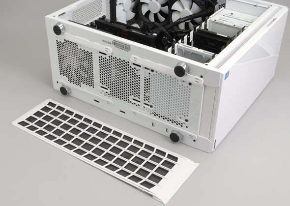 そして天面には、標準のDefine R5には付属しない、サイコムオリジナルのメッシュカバーを装着している。天面の開口部からのホコリやゴミの侵入も防ぐ効果とともに、標準のままではやや頼りない外観を引き締める役割も果たしている。適度な強さのマグネットで着脱できるため、メンテナンスも楽に行なえる。