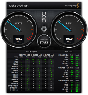 Blackmagic Disk Speed Testは以下の通り。MK452J/Aは、リード、ライトともに100Mバイト/秒弱という結果で、SSDが一般的なストレージになりつつある昨今の環境では遅いと感じる場面は多いかもしれない。より快適なレスポンスを望むなら、CTOでFusion DriveやSSDを選択するのも手だ。ただ、256GバイトSSDが2万4000(税別)、512GバイトSSDなら6万円(税別)の追加投資と、やや高額になるので悩ましいところ。