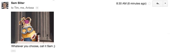 メールの送信ボタンの代わりにこのボタンをクリックすると、映画「怪盗グルー」に登場するミニオンのGIF動画が相手に届くというもので、このメールに返信しても送信側に届かない点がさらに混乱を招く結果に。