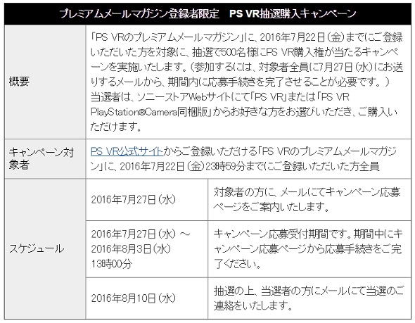 7月22日までにPS VRのプレミアムメールマガジンに登録しているユーザーを対象に、PS VR抽選購入キャンペーンも実施する。7月27日に届くメールからキャンペーンに応募すると、抽選で500人にソニーストアでPS VR購入券が当たるという。当選者は、ソニーストアWebサイトにて「PS VR」または「PS VR PlayStation Camera同梱版」のいずれかを購入できる。